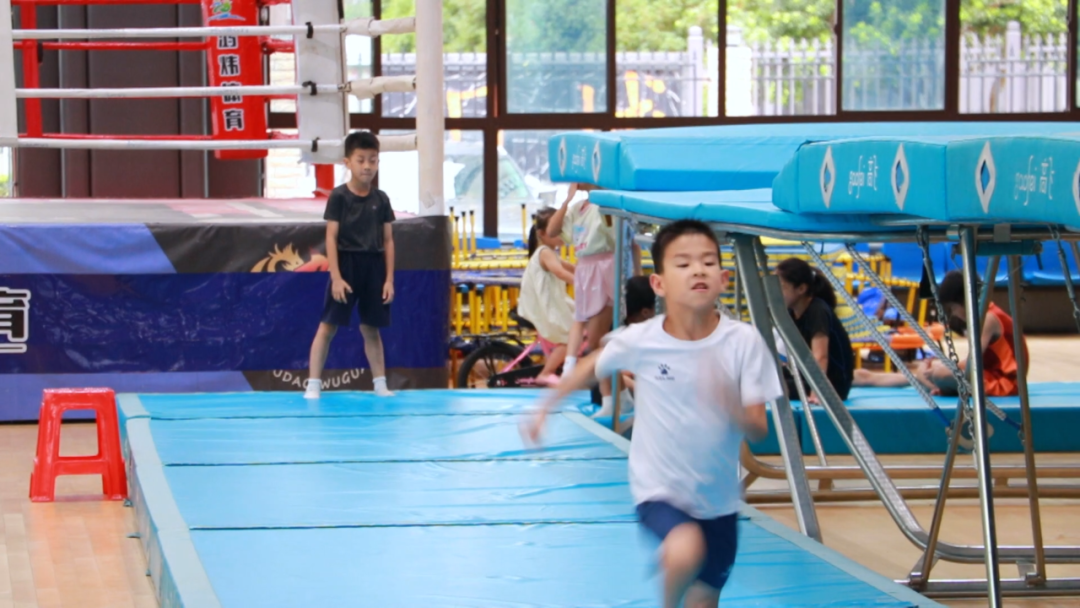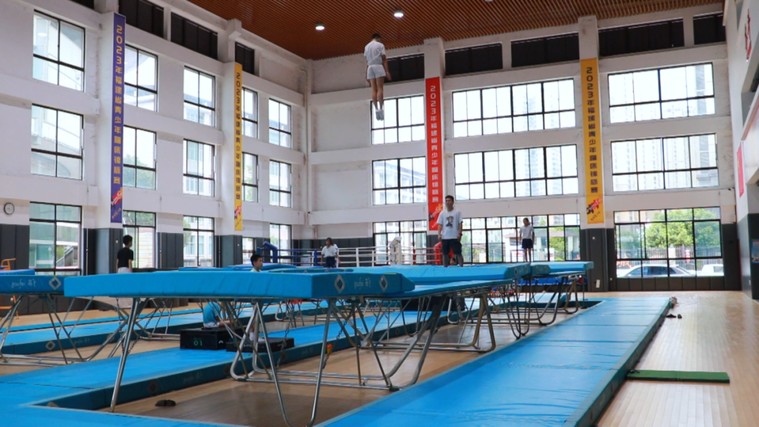 在新區體育館內,運動員們正在教練的指導下積極投入訓練。彈網上不斷躍動的身影與教練精準的口令交織,構成一幅動感十足的訓練景象。孩子們全神貫注的完成每一個動作,每個動作都在訴說著他們平時訓練的刻苦與堅持。