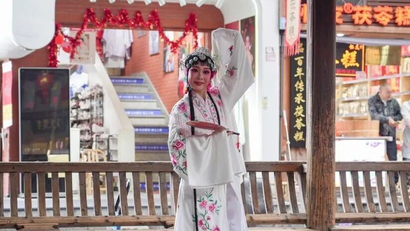 “風(fēng)雨連廊”內(nèi),閩劇與建州唱曲子同聲相應(yīng),雙城戲曲同臺(tái)共鳴。