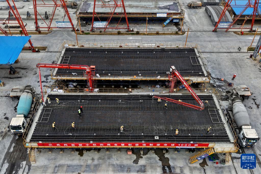 3月26日,工人在中鐵四局寶慧制梁場1000榀箱梁澆筑施工現場進行混凝土澆筑作業。