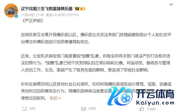 荔枝新闻讯 11月4日晚,辽宁男篮发布声明,称自郭艾伦离开我俱乐部后,“饭圈”乱象已搅扰球队经常检察比赛。以下为辽篮声明全文: