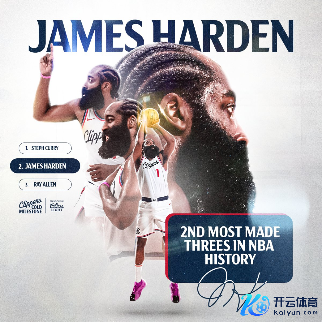 在上一场快船客场104-125不敌火箭的比赛,哈登全场获取21分,其中他首节就掷中3记三分,但随后再也莫得三分掷中,成为快船输球的败因之一。哈登借助上一场掷中3记三分,生计惯例赛三分掷中数擢升至2973记三分,厚爱追平雷-阿伦升至历史比肩第二位。